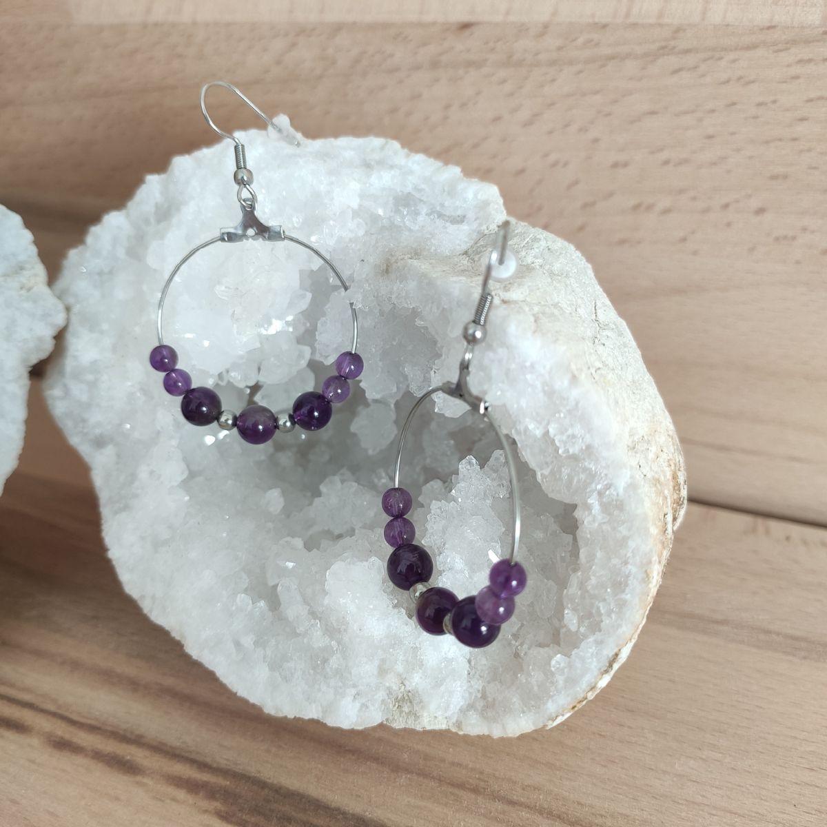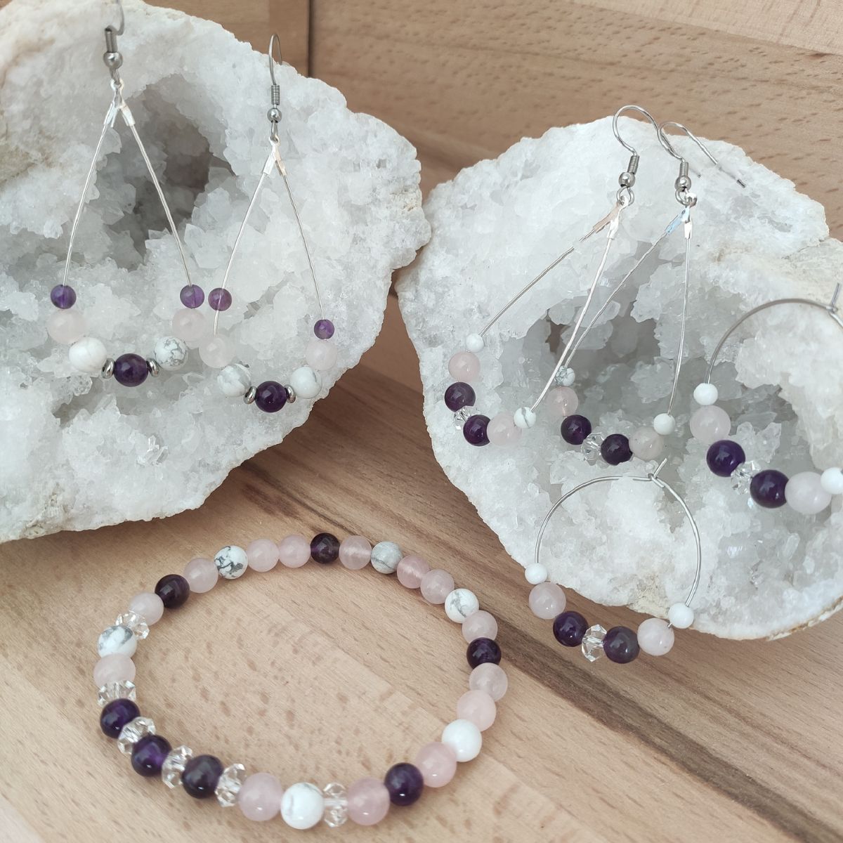 Boucles d’oreilles Réconfort – Pierres Naturelles : Améthyste, Quartz Rose, Howlite & Cristal de Roche (Copie)